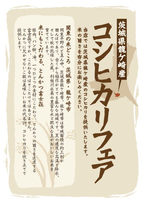茨城県龍ケ崎市の米・トマトが主役の龍ケ崎フェアを11店舗を対象に 2月25日(水) ~ 3月21(土) の期間中に開催いたします。 とんかつ専門店「富士㐂(ふじき)」の都内5店舗にて「龍ケ崎産コシヒカリ」を提供するほか、 …続きを読む