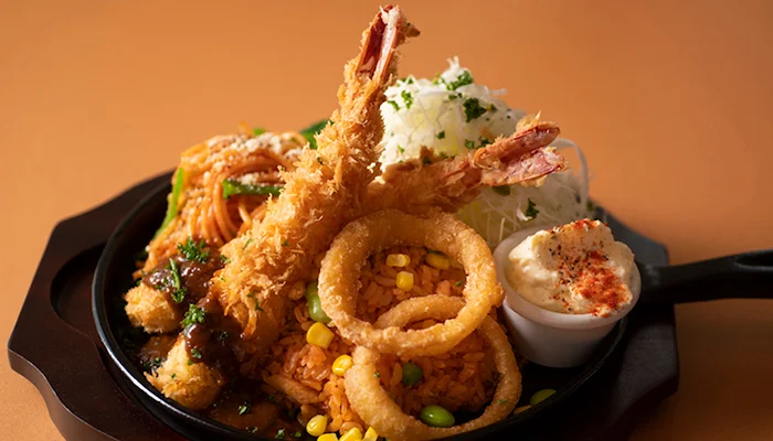 百貨店の洋食屋さんで味わうオムライスやハンバーグ、エビフライやカツのメニューと、昔ながらの郷愁漂う店内の雰囲気をお楽しみください。定番メニューはもちろん、テーブルに熱々をお出しする鉄板プレートメニューが当店人気の品です。ご家族揃ってご一緒にテーブルを囲んでいただけます。