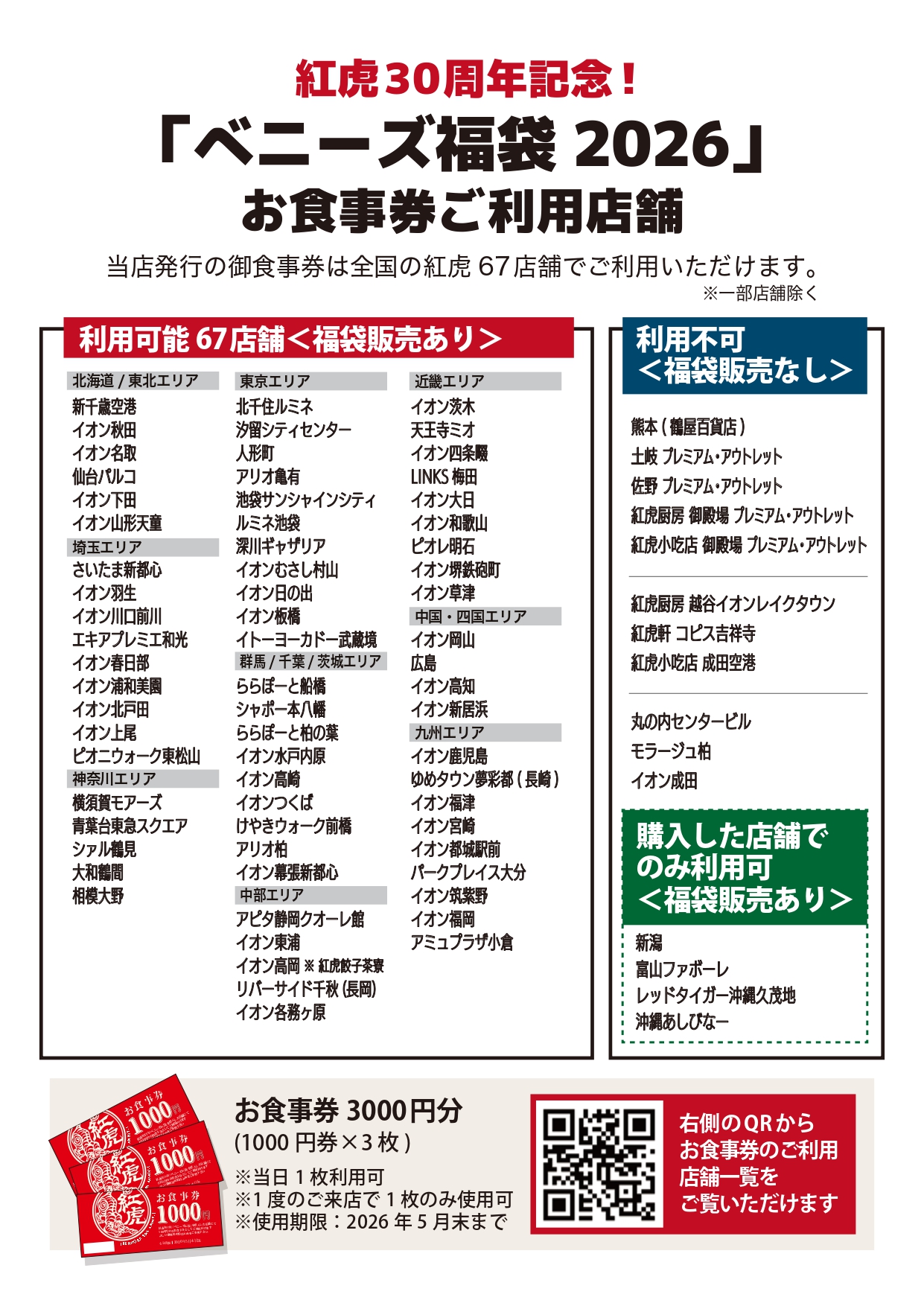 紅虎餃子房 2026年は創業30周年。感謝を込めて、30周年記念「ベニーズ福袋」販売決定